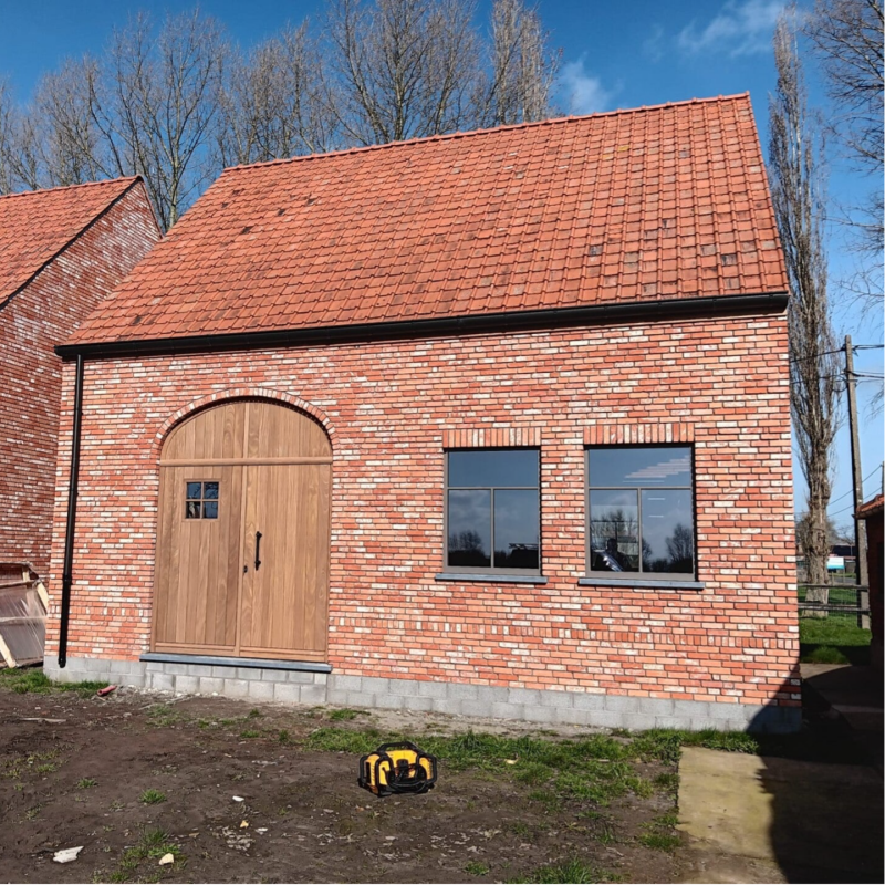 In de bureauruimte werd opnieuw een mooie afwerking gerealiseerd: de plaatsing van een houten deur met korfboog. Een detail waar we al even naar uitkeken, en dat meteen een grote impact heeft op de uitstraling van het geheel.